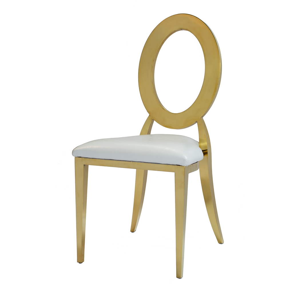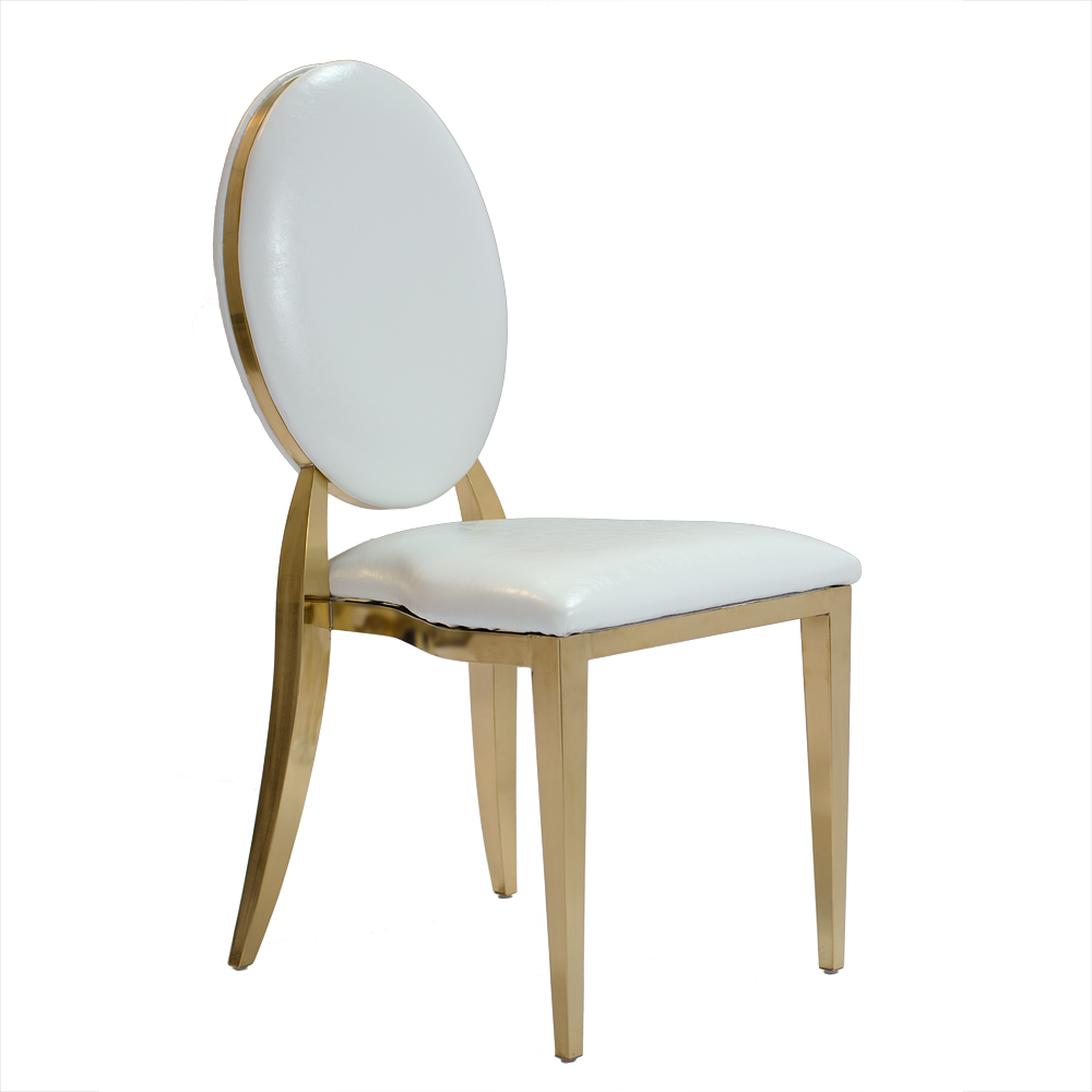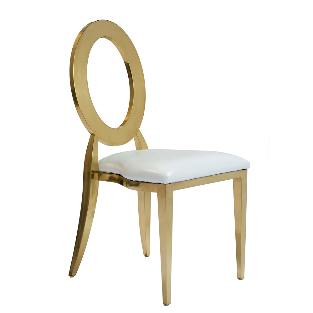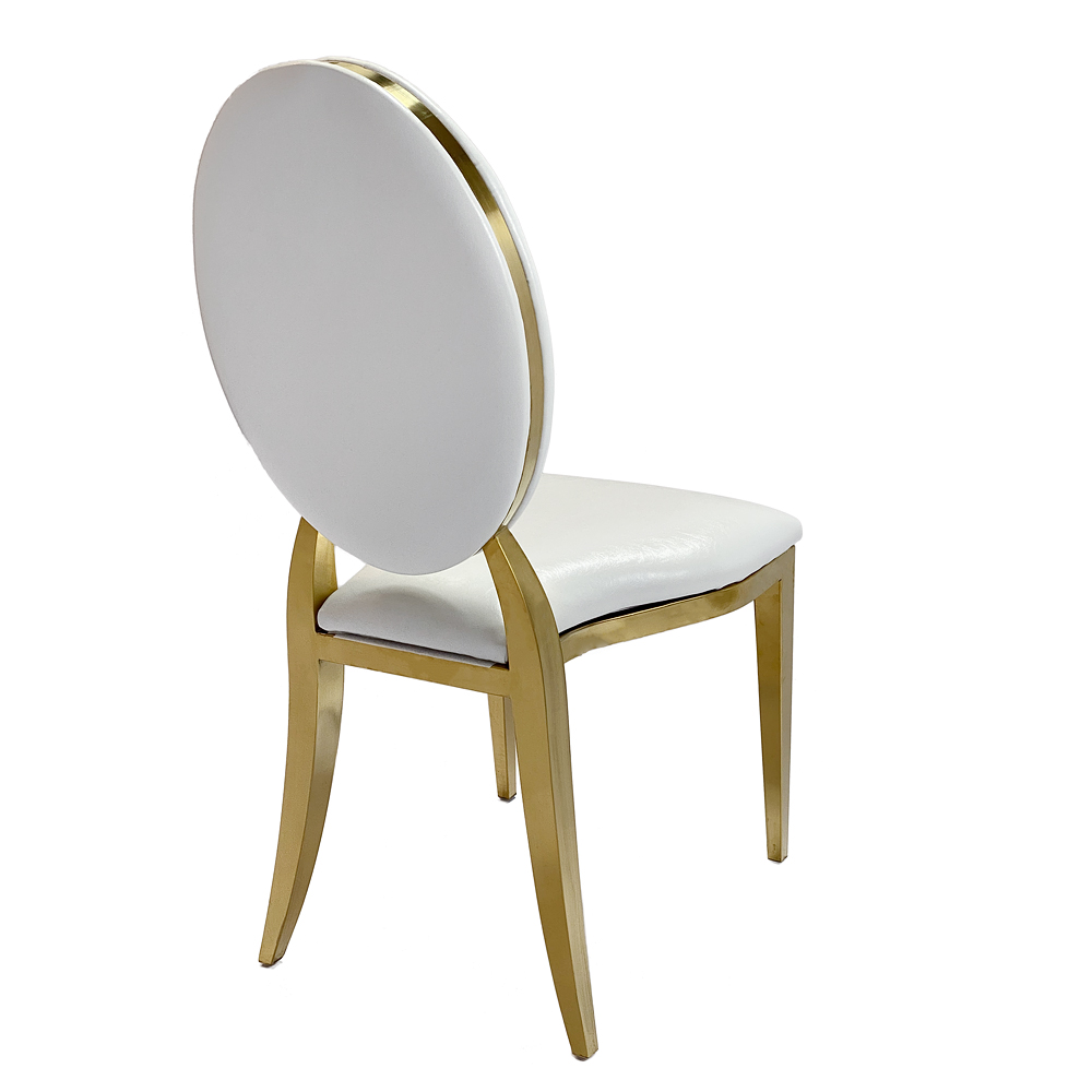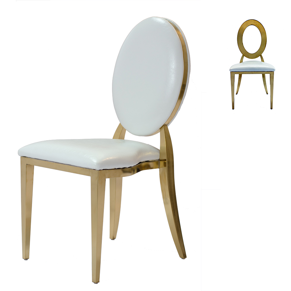 svatební a banketová židle O-Back dva v jednom je model, který se přizpůsobuje požadavkům zákazníků. Jednoho dne může být elegantním kusem nábytku se zlatým zrcadlovým rámem z nerezové oceli a sedákem a opěrkou z bílé klasické eko-kůže a dalšího dne se může prezentovat jako neobyčejný kus nábytku vyzařující luxus s bílým sedákem a kulatou zlatou opěrkou bez čalounění. Jedná se o židli, která je nejen krásná, ale také velmi odolná a funkční. Opěradlo a sedák byly navrženy tak, aby je bylo možné kdykoli demontovat, proto byly použity silné a tlusté suché zipy. Informace o suchých zipách samozřejmě u zákazníků vyvolává nostalgii, ujišťujeme však, že jsou vyrobeny z pevného materiálu a jsou dostatečně silné, aby nedošlo k nechtěnému odmontování během večírku. Na nohách židlí jsou použity plastové koncovky, aby nedošlo k poškození podlahy v elegantním interiéru. Díky pevné a odolné oceli použité na výrobu rámu má židle nosnost až 160 kg. Židle O-back lze samozřejmě stohovat, což šetří skladovací prostor a usnadňuje případnou přepravu.
