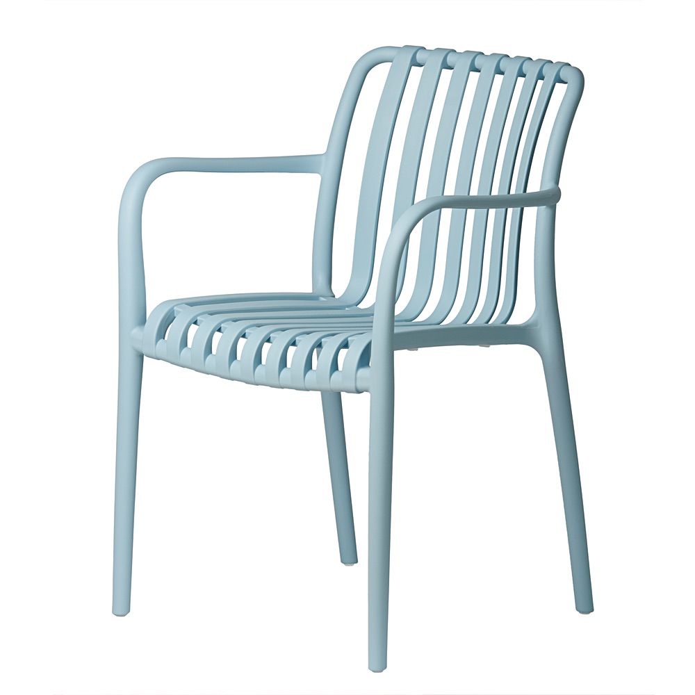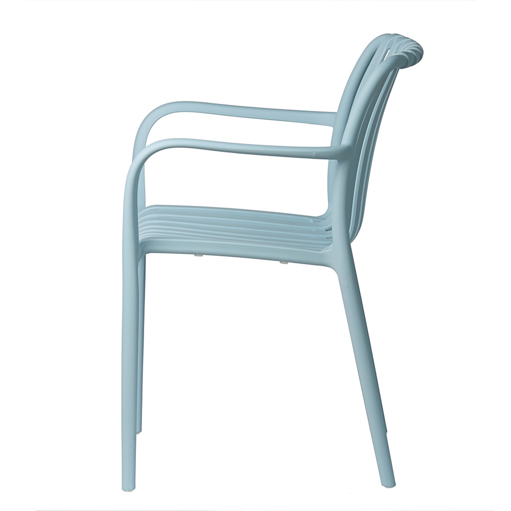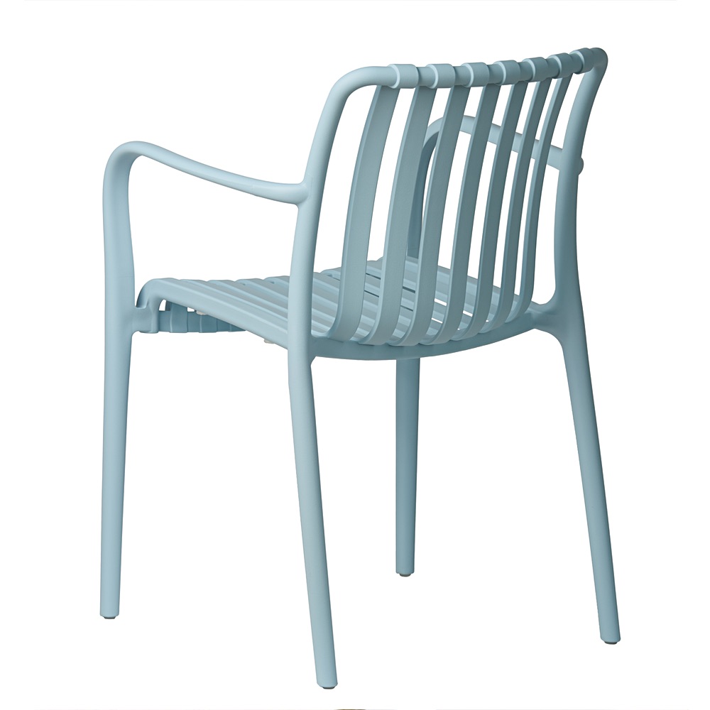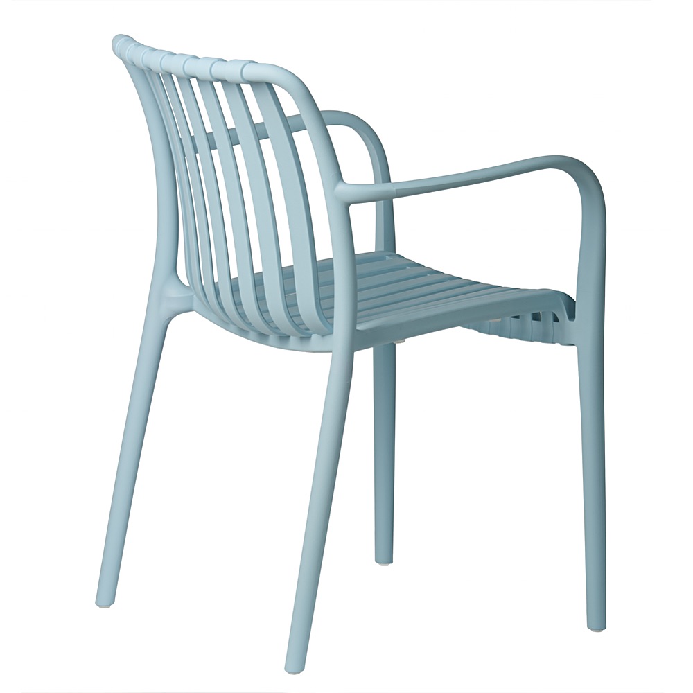 Modrá zahradní židle Aura se skvěle hodí jako židle na terasu, balkonová židle s područkami, součást zahradní sestavy nebo vybavení restaurační terasy. Lehká konstrukce usnadňuje přemísťování a hladký povrch umožňuje rychlé čištění pomocí vlhkého hadříku.