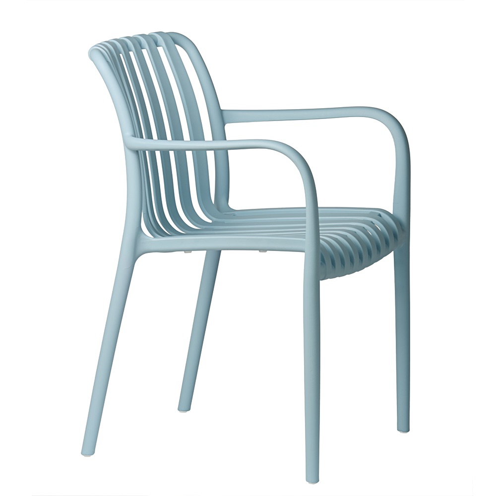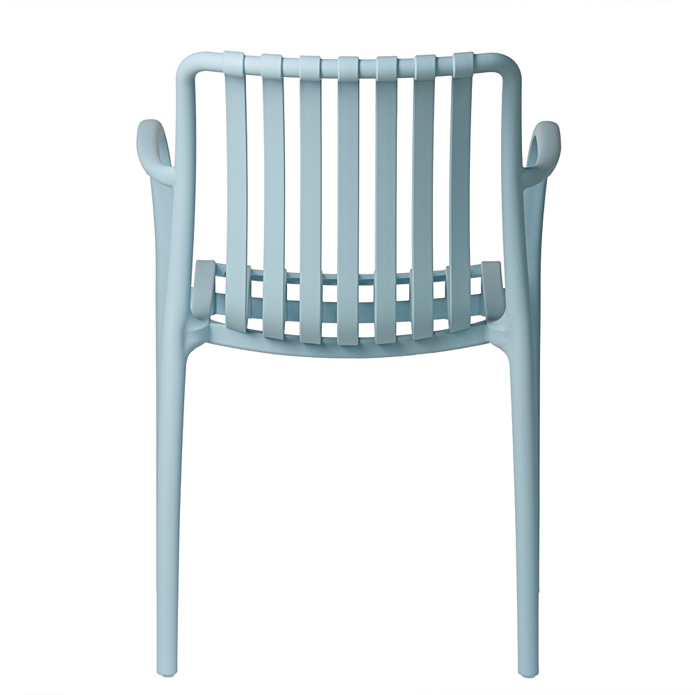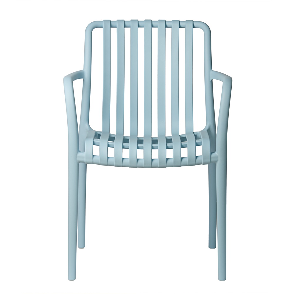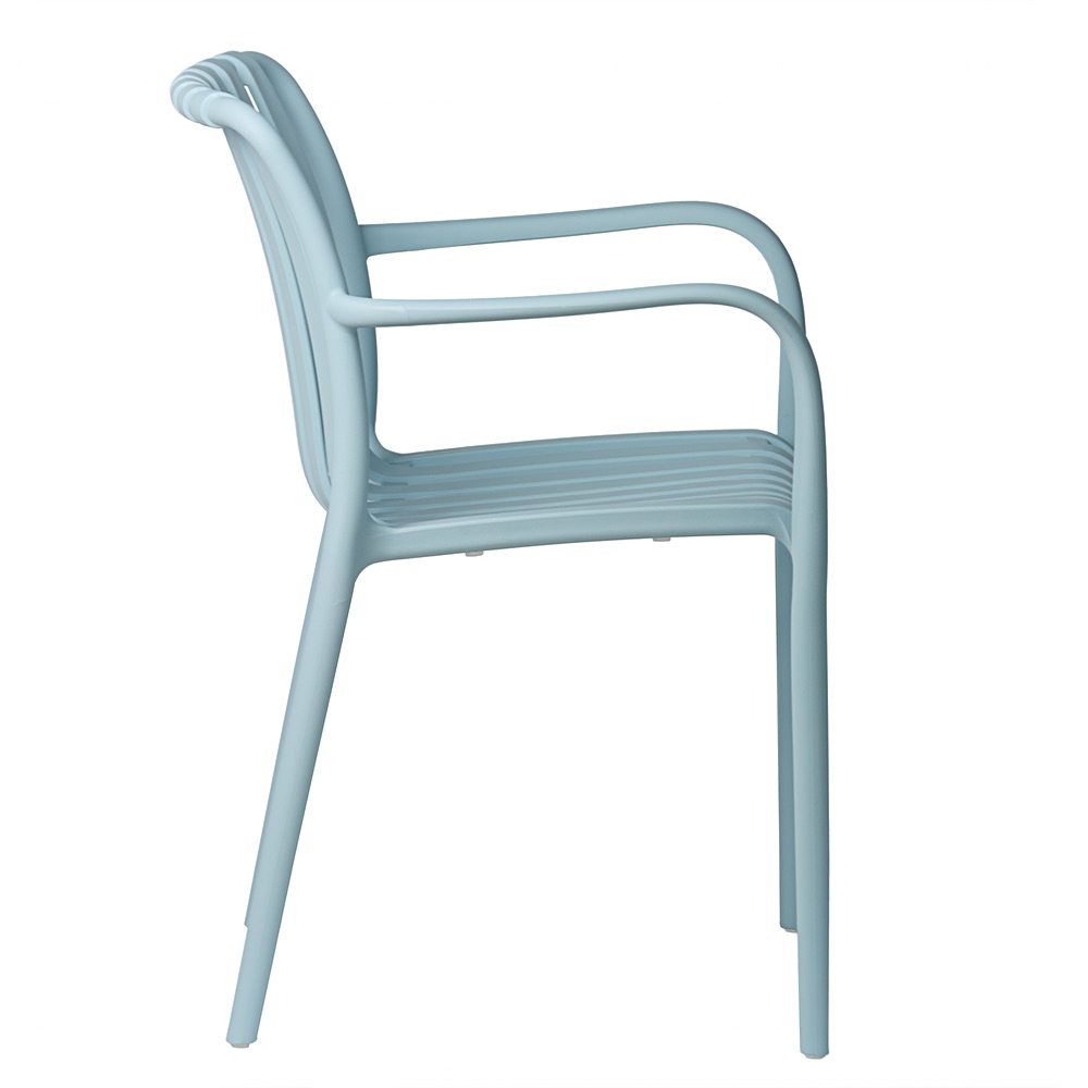 Modrá zahradní židle Aura se skvěle hodí jako židle na terasu, balkonová židle s područkami, součást zahradní sestavy nebo vybavení restaurační terasy. Lehká konstrukce usnadňuje přemísťování a hladký povrch umožňuje rychlé čištění pomocí vlhkého hadříku.