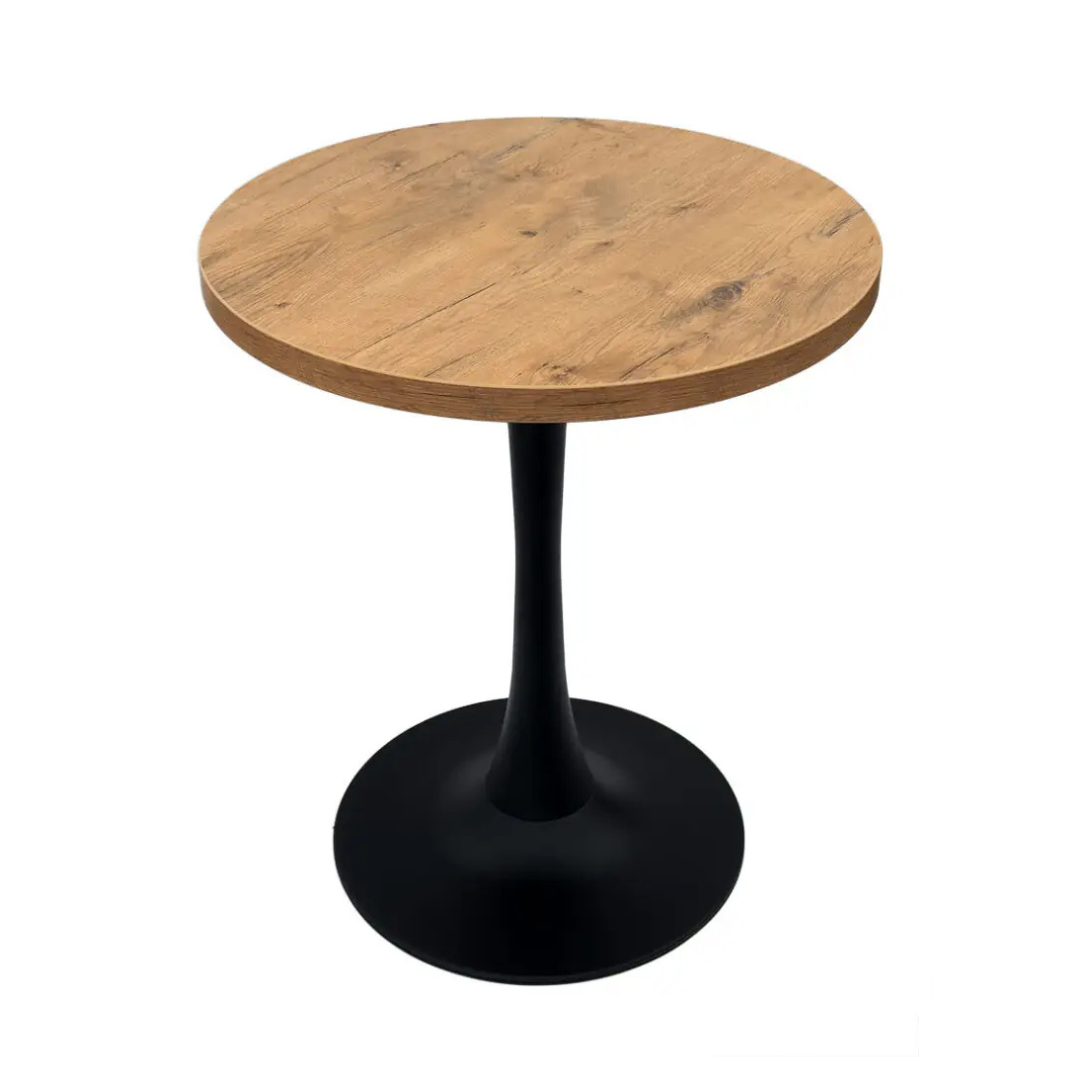 • Kovová konstrukce: Stůl je vybaven pevnou černou kulatou podnoží z kovu. Zajišťuje stabilitu a pevnost, což je mimořádně důležité ve veřejných prostorách, kde je nábytek hojně využíván.
